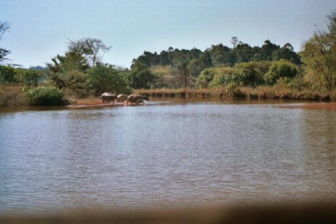 Im Mlilwane-Reservat. Blick vom Restaurant auf den See mit Nilpferden.Mlilwane Reserve. View from the restaurant at the lake with hippos.