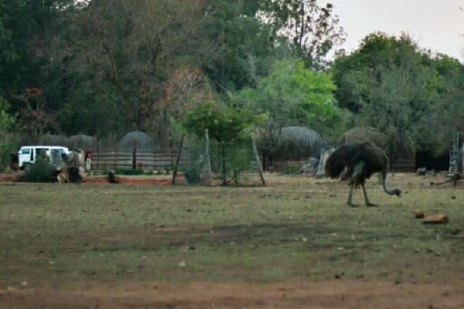 Mlilwane: Ein Strauss spaziert durchs Camp.Mlilwane: An ostrich walking through the camp.