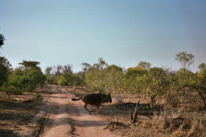 Mkhaya Reservat: Ein Gnu springt über die Fahrbahn.Mkhaya Reserve: A gnu crossing our path.
